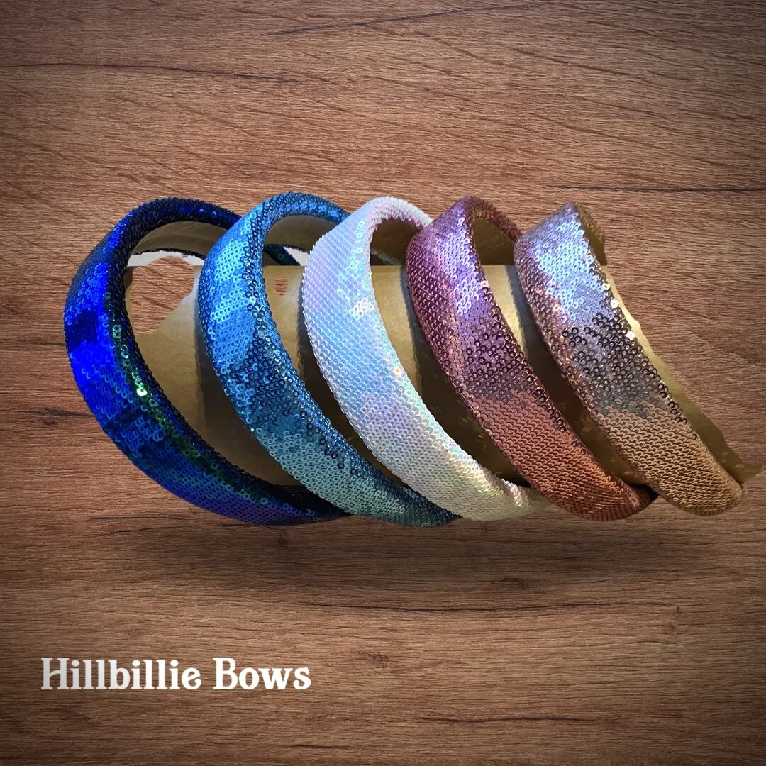 Shimmery mermaid scale sequins cover these wide, padded headbands to combine glitz with all day comfort.